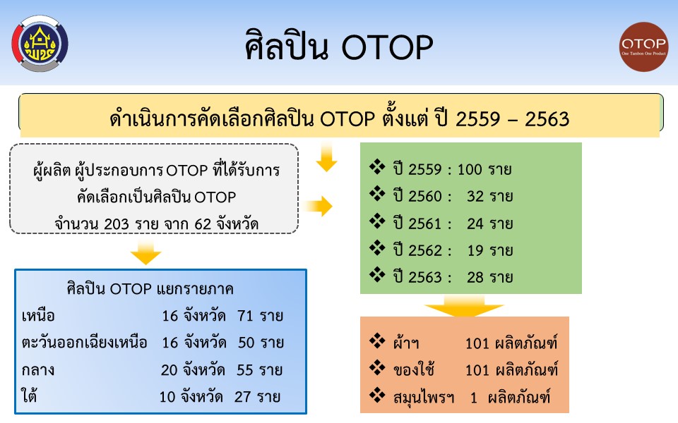 กรมการพัฒนาชุมชน ดำเนินโครงการ “ศิลปิน OTOP” มาตั้งแต่ปีงบประมาณ 2559 โดยการพิจารณาคัดเลือก ศิลปิน OTOP จากคณะกรรมการผู้ทรงคุณวุฒิ เพื่อยกย่อง เชิดชูเกียรติ ในฐานะ เป็นผู้อนุรักษ์สืบสาน ภูมิปัญญาท้องถิ่น และเผยแพร่ผลงานของบุคคลที่ได้ร่วมอนุรักษ์ ร่วมสืบทอดภูมิปัญญาท้องถิ่น ผสมผสานการสร้างสรรค์ เกิดเป็นผลิตภัณฑ์ OTOP ทรงคุณค่าอย่างต่อเนื่อง จนเป็นที่ประจักษ์ และได้รับการยอมรับจากสังคมอย่างกว้างขวาง และมีการถ่ายทอดภูมิปัญญาสู่เยาวชนและผู้สนใจ อีกทั้งยังสร้างคุณค่าและมูลค่าของผลิตภัณฑ์ OTOP ก่อเกิดการสร้างงาน สร้างอาชีพ สร้างรายได้ให้แก่ชุมชน โดยปัจจุบันมีศิลปิน OTOP จำนวน 175 ราย