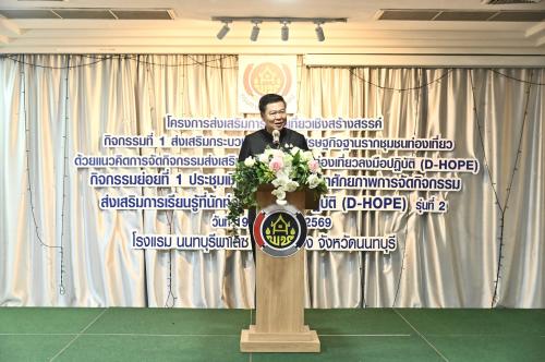 วันที่ 19 มีนาคม 2569 เวลา 13.30 น. ณ โรงแรมนนทบุรี พาเลซ จังหวัดนนทบุรี นายไพโรจน์ โสภาพร รองอธิบดีกรมการพัฒนาชุมชน เป็นประธานในพิธีเปิดการประชุมเชิงปฏิบัติการพัฒนาศักยภาพการจัดกิจกรรมส่งเสริมการเรียนรู้ที่นักท่องเที่ยวลงมือปฏิบัติ (D-HOPE) ภายใต้โครงการส่งเสริมการท่องเที่ยวเชิงสร้างสรรค์ ประจำปีงบประมาณ พ.ศ. 2569 รุ่นที่ 2 โดยมี นางสาวริตยา รอดนิ่ม รักษาการในตำแหน่งผู้เชี่ยวชาญเฉพาะด้านการพัฒนาชุมชน เป็นผู้กล่าวรายงาน พร้อมด้วยคณะวิทยากร และผู้แทนชุมชนท่องเที่ยว OTOP นวัตวิถี เข้าร่วมกิจกรรมอย่างพร้อมเพรียง