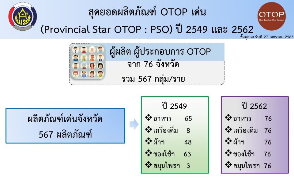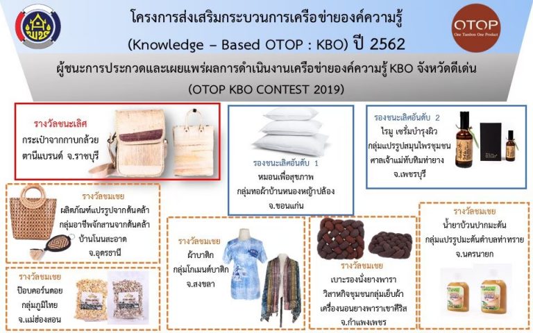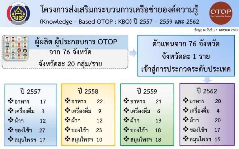 โดยกรมการพัฒนาชุมชนได้สนับสนุนให้มีเครือข่ายองค์ความรู้ Knowledge – Based OTOP : KBO จำนวน 75 เครือข่าย จัดทำทะเบียนเครือข่ายองค์ความรู้ KBO สนับสนุนให้กลุ่มผู้ผลิตชุมชนมีการเรียนรู้จากเครือข่าย KBO จังหวัด พร้อมทั้งหาความต้องการกลุ่มผู้ผลิต/ผู้ประกอบการ OTOP (Training Needs : TN)