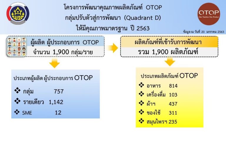 2) เพื่อพัฒนายกระดับคุณภาพมาตรฐานผลิตภัณฑ์ OTOP กลุ่มปรับตัวสู่การพัฒนา (Quadrant D) กลุ่มปรับตัวสู่การพัฒนา (Quadrant D) ให้มีคุณภาพและศักยภาพทางการตลาดเพิ่มขึ้น
