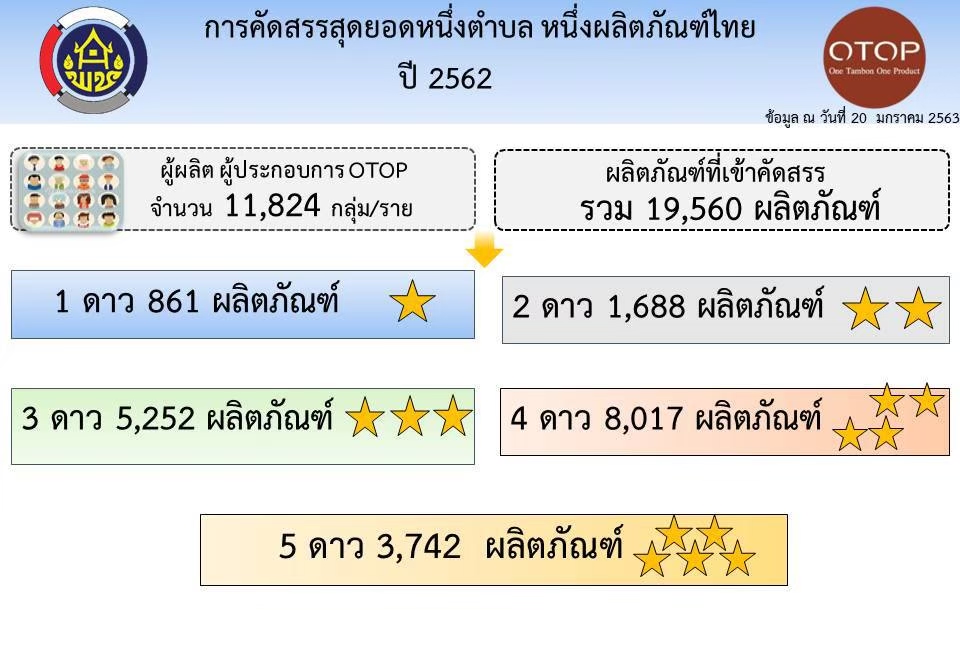 กรมการพัฒนาชุมชนดำเนินการลงทะเบียนผู้ผลิต ผู้ประกอบการ OTOP ปี 2562 จัดแบ่งประเภทผลิตภัณฑ์ออกเป็น 5 ประเภท รวมผลิตภัณฑ์ที่ลงทะเบียน จำนวน 186,356 ผลิตภัณฑ์ ดังนี้