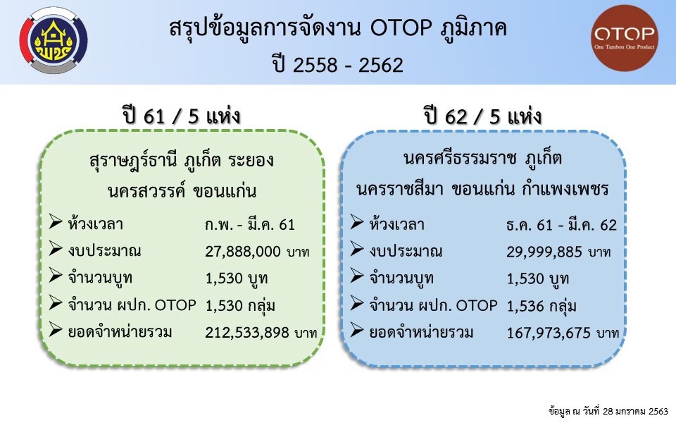 กรมการพัฒนาชุมชน ในฐานะหน่วยงานภาครัฐที่ให้การสนับสนุน ส่งเสริม และดูแลสินค้า (OTOP) จึงได้ดำเนินการจัดทำโครงการจัดงาน (OTOP) ภูมิภาค เพื่อเผยแพร่ภูมิปัญญาในการพัฒนาสินค้า เป็นแหล่งแลกเปลี่ยนเรียนรู้การพัฒนาสินค้า (OTOP) รวมทั้งสร้างโอกาสช่องทางการตลาดแก่สินค้า (OTOP)