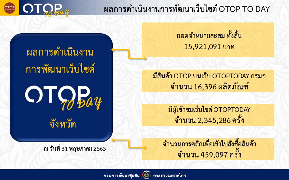 การดำเนินงานส่งเสริมด้านการตลาด เพื่อเพิ่มช่องทางการจำหน่ายผลิตภัณฑ์ให้กลุ่มผู้ผลิต ผู้ประกอบการ OTOP มีรายได้เพิ่มขึ้น กรมการพัฒนาชุมชน ดำเนินการส่งเสริมทั้งรูปแบบการตลาด Offline เช่น การดำเนินงานศูนย์แสดงและจำหน่าย OTOP ตลาดประชารัฐคนไทยยิ้มได้ การจัดแสดงและจำหน่ายในลักษณะงาน Event และรูปแบบการตลาด Online
