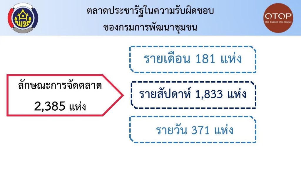 แนวคิด : ส่งเสริมการจัดการตลาดชุมชนที่มีความพร้อมที่มีอัตลักษณ์ของท้องถิ่น การท่องเที่ยวชุมชน กระตุ้นการค้าขาย โดยดำเนินการในปี 2559-2560 จำนวน 151 แห่ง ในปี 2561 คาดว่าจะเพิ่มเติม 77 แห่ง (77 จังหวัด)