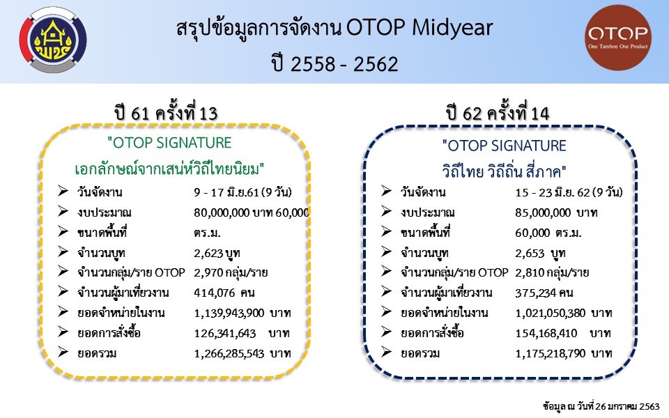 กรมการพัฒนาชุมชน ในฐานะที่ได้รับมอบหมายให้รับผิดชอบดำเนินการส่งเสริมการดำเนินงานโครงการหนึ่งตำบล หนึ่งผลิตภัณฑ์ เพื่อส่งเสริมให้กลุ่มผู้ผลิตผู้ประกอบการ OTOP ที่มีคุณภาพและมีศักยภาพ ได้นำเสนอผลงานที่มีคุณภาพไปสู่ตลาดสากล เป็นการเพิ่มช่องทางการตลาดและสร้างรายได้ให้กับชุมชน ซี่งกรมการพัฒนาชุมชน ได้จัดงาน OTOP Midyear ตั้งแต่ปี 2546