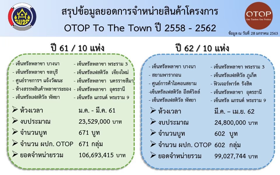2) การจัดจำหน่ายผลิตภัณฑ์หนึ่งตำบล หนึ่งผลิตภัณฑ์ OTOP และอาหารเด่น OTOP ชวนชิม โดยการกำหนดโควตาให้จังหวัดคัดเลือกผลิตภัณฑ์ OTOP ในระดับ 3-5 ดาว รวมทั้งการจำหน่ายอาหารชวนชิมของทุกจังหวัดและกรุงเทพมหานครและอาหารฮาลาล