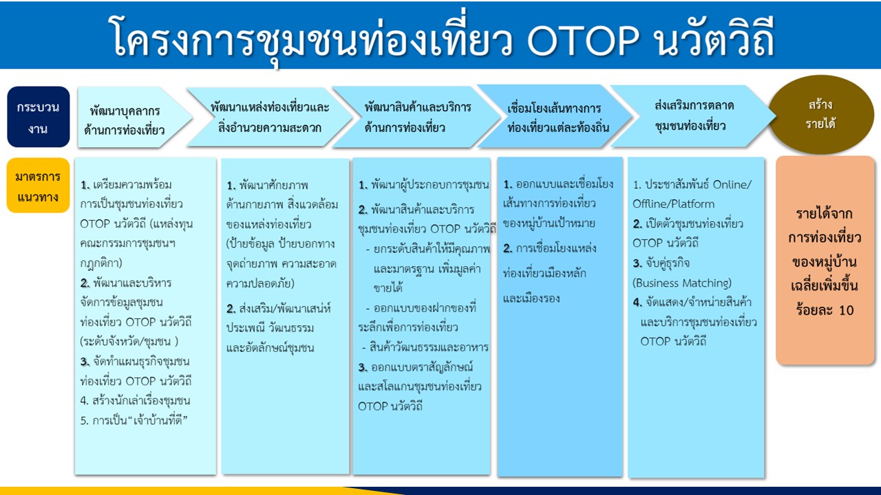 2) พัฒนาเชิงพื้นที่ผ่านกระบวนการประชาคม การเข้าถึงแหล่งเงินทุนในการพัฒนาอาชีพและสร้างรายได้ในชุมชน สนับสนุนวิสาหกิจชุมชน และส่งเสริมการท่องเที่ยวชุมชน เชื่อมโยงเส้นทางการท่องเที่ยวในแต่ละท้องถิ่น