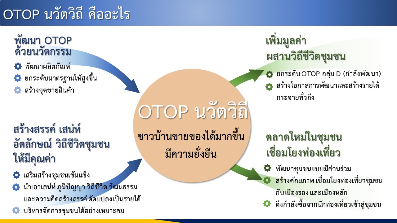 รัฐบาลมีนโยบายลดความเหลื่อมล้ำของสังคมที่มุ่งเน้นสร้างรายได้และความเจริญความเข้มแข็งทางเศรษฐกิจ โดยให้ภาคเอกชนและภาคประชาชนเข้ามามีส่วนร่วมดำเนินการร่วมกับภาครัฐเพื่อให้บรรลุวิสัยทัศน์ มั่นคง มั่งคั่ง ยั่งยืน ซึ่งสอดคล้องกับการดำเนินงานโครงการหนึ่งตำบล หนึ่งผลิตภัณฑ์ (OTOP) ที่เริ่มตั้งแต่ปี พ.ศ. 2544 ในทุกภูมิภาคทั่วประเทศ โดยมีการแต่งตั้งคณะกรรมการระดับประเทศ คือ คณะกรรมการอำนวยการ หนึ่งตำบล หนึ่งผลิตภัณฑ์แห่งชาติ (กอ.นตผ.) เป็นผู้ขับเคลื่อน และมอบหมายให้กรมการพัฒนาชุมชน เป็นผู้รับผิดชอบหลักส่งเสริมการดำเนินงาน OTOP ร่วมกับหน่วยงานต่าง ๆ ในการสนับสนุน ส่งเสริม ยกระดับผลิตภัณฑ์ และพัฒนาช่องทางการตลาดที่หลากหลายเพื่อให้สามารถจำหน่ายได้ และมุ่งปรับตัวสู่การค้าแบบสากล