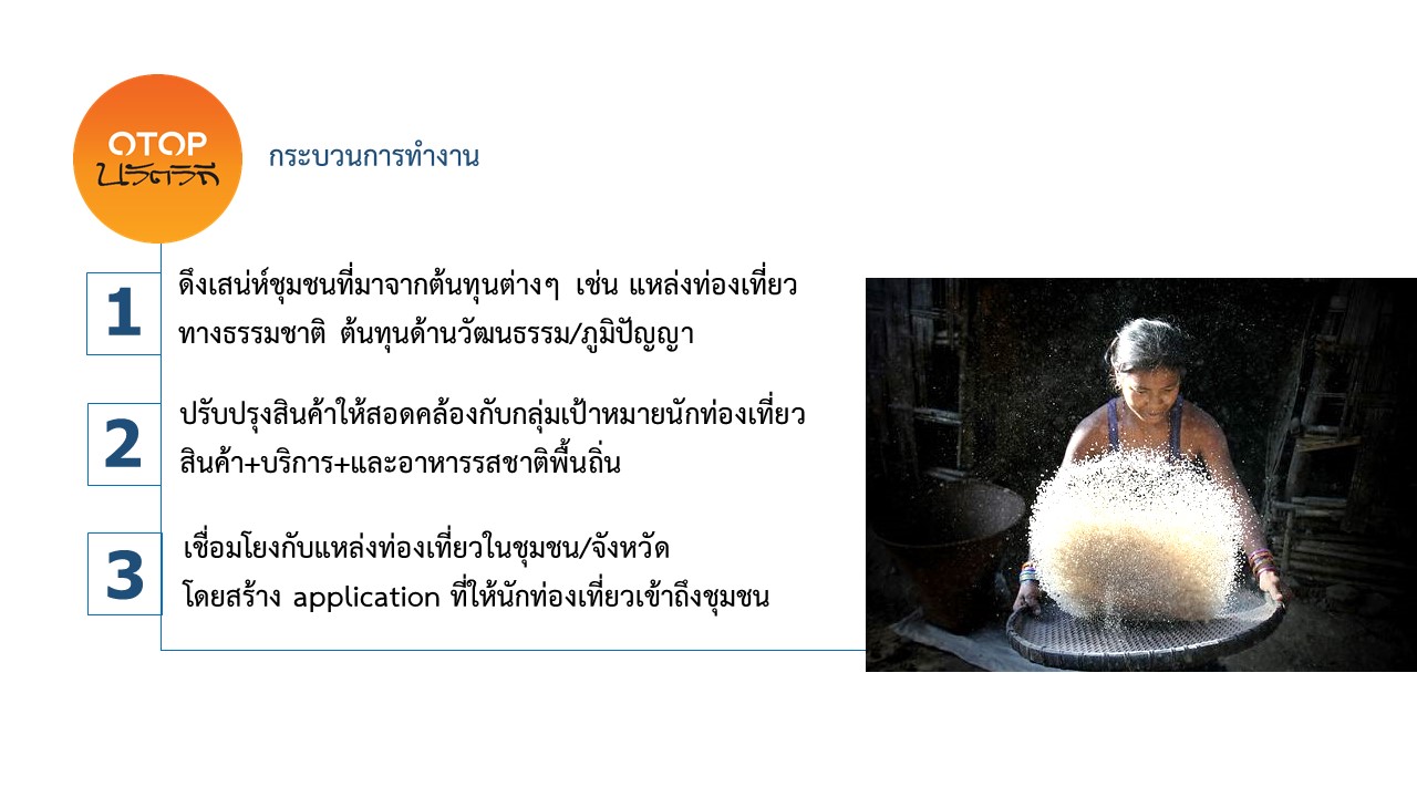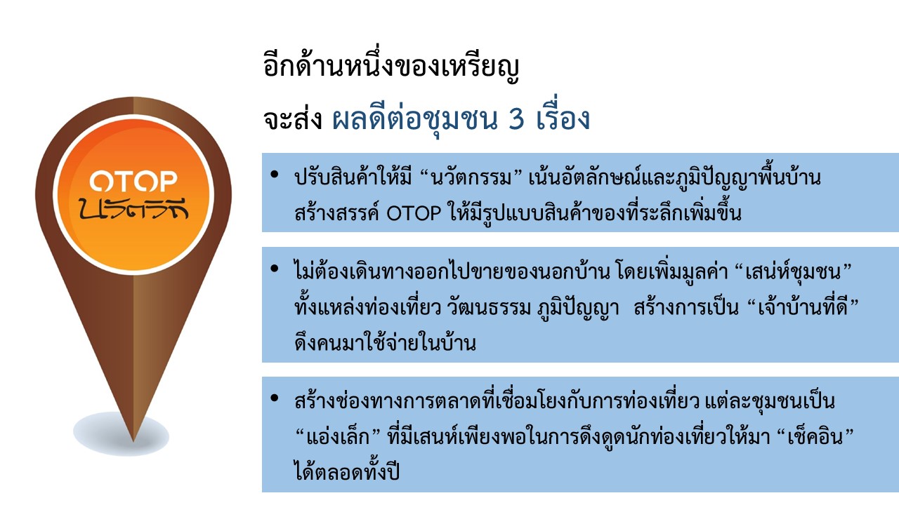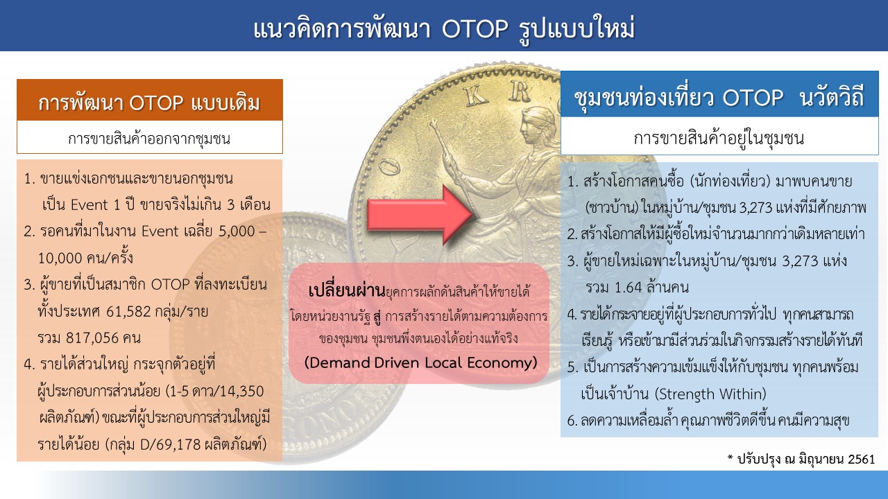 ดังนั้น จำเป็นต้องมีการเปลี่ยนผ่านยุคการผลักดันขายสินค้า OTOP ออกจากชุมชนเพียงด้านเดียว สู่การเพิ่มชองทางสร้างรายได้ตามความต้องการ (Demand Driven Local Economy) โดยการขายสินค้าอยู่ในชุมชน ใช้เสน่ห์ ภูมิปัญญา วิถีชีวิต วัฒนธรรม และความคิดสร้างสรรค์ แปลงเป็นรายได้ ทั้งนี้ครอบครัวและลูกหลานยังอยู่ร่วมกัน ไม่ต้องแข่งขันนำผลิตภัณฑ์ออกไปขายนอกชุมชน เป็นชุมชนท่องเที่ยวที่เป็นเจ้าบ้านที่ดี ชวนกันคิด ชวนกันทำ ผลิตสินค้าและบริการ รวมทั้งมีการเชื่อมโยงเส้นทางท่องเที่ยวระดับชุมชน ที่มีเสน่ห์ดึงดูด และมีคุณค่าเพียงพอให้นักท่องเที่ยวเข้ามาเยี่ยมเยือนและใช้จ่ายเงินในทุกกิจกรรมของชุมชน ซึ่งรายได้จะกระจายอยู่กับคนในชุมชน ทุกคนมีความสุข เป็นการสร้างความเข้มแข็งให้กับชุมชน (Strength with in) และพัฒนาเศรษฐกิจฐานรากอย่างแท้จริง
