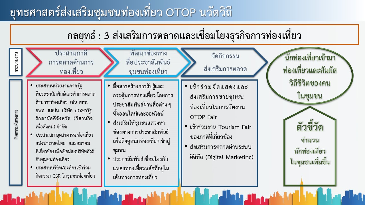 กลยุทธ์ที่ 3 ส่งเสริมการตลาดและเชื่อมโยงธุรกิจการท่องเที่ยว ประกอบด้วย 3 กระบวนงาน ได้แก่ กระบวนงานที่ 1 ประสานภาคีการตลาดด้านการท่องเที่ยว กระบวนงานที่ 2 พัฒนาช่องทางสื่อประชาสัมพันธ์ชุมชนท่องเที่ยว และกระบวนงานที่ 3 จัดกิจกรรมส่งเสริมการตลาด ทั้งนี้ ได้กำหนดเป้าหมายกลยุทธ์ คือ นักท่องเที่ยวเข้ามาท่องเที่ยวและสัมผัสวิถีชีวิตของคนในชุมชน
