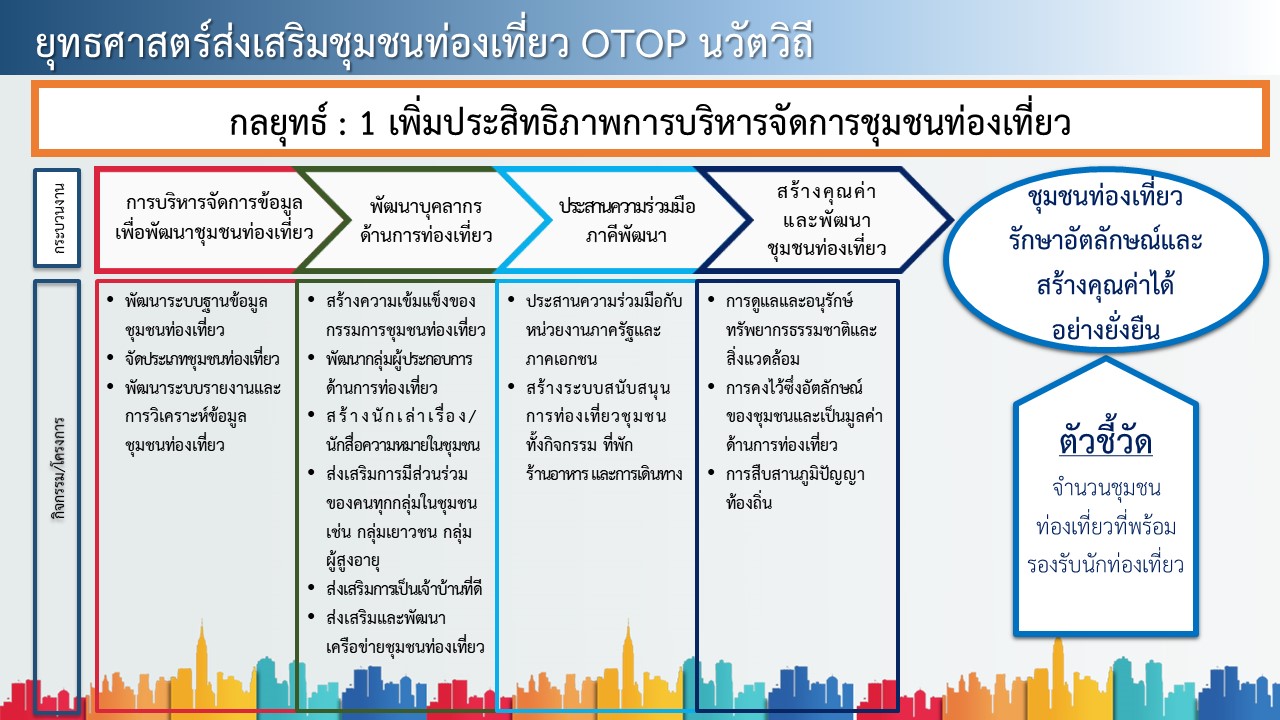 กลยุทธ์ที่ 1 เพิ่มประสิทธิภาพการบริหารจัดการชุมชนท่องเที่ยว ประกอบด้วย 4 กระบวนงาน ได้แก่ กระบวนงานที่ 1 บริหารจัดการข้อมูลเพื่อพัฒนาชุมชนท่องเที่ยว กระบวนงานที่ 2 พัฒนาบุคลากรด้านการท่องเที่ยว กระบวนงานที่ 3 ประสานความร่วมมือภาคีการพัฒนา และกระบวนงานที่ 4 สร้างคุณค่าและพัฒนาชุมชนท่องเที่ยว ทั้งนี้ ได้กำหนดเป้าหมายกลยุทธ์ คือ ชุมชนท่องเที่ยวรักษาอัตลักษณ์และสร้างคุณค่าได้อย่างยั่งยืน