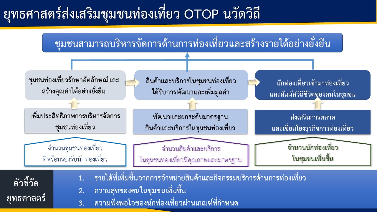 กรมการพัฒนาชุมชน กำหนดยุทธศาสตร์ส่งเสริมชุมชนท่องเที่ยว OTOP นวัตวิถี เพื่อเป็นแนวทางสำหรับการส่งเสริม พัฒนา และต่อยอดการดำเนินโครงการชุมชนท่องเที่ยว OTOP นวัตวิถี โดยมีเป้าหมายยุทธศาสตร์ กล่าวคือ ชุมชนสามารถบริหารจัดการด้านการท่องเที่ยวและสร้างรายได้อย่างยั่งยืน ประกอบด้วย 3 กลยุทธ์ ได้แก่