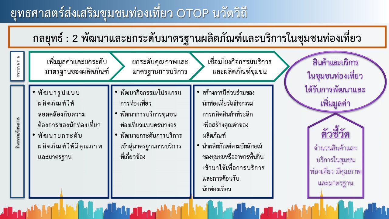 กลยุทธ์ที่ 2 พัฒนาและยกระดับมาตรฐานผลิตภัณฑ์และบริการในชุมชนท่องเที่ยว ประกอบด้วย 3 กระบวนงาน ได้แก่ กระบวนงานที่ 1 เพิ่มมูลค่าและยกระดับมาตรฐานของผลิตภัณฑ์ กระบวนงานที่ 2 ยกระดับคุณภาพและมาตรฐานการบริการ และกระบวนงานที่ 3 เชื่อมโยงกิจกรรมบริการและผลิตภัณฑ์ชุมชน ทั้งนี้ ได้กำหนดเป้าหมายกลยุทธ์ คือ สินค้าและบริการในชุมชนท่องเที่ยวได้รับการพัฒนาและเพิ่มมูลค่า